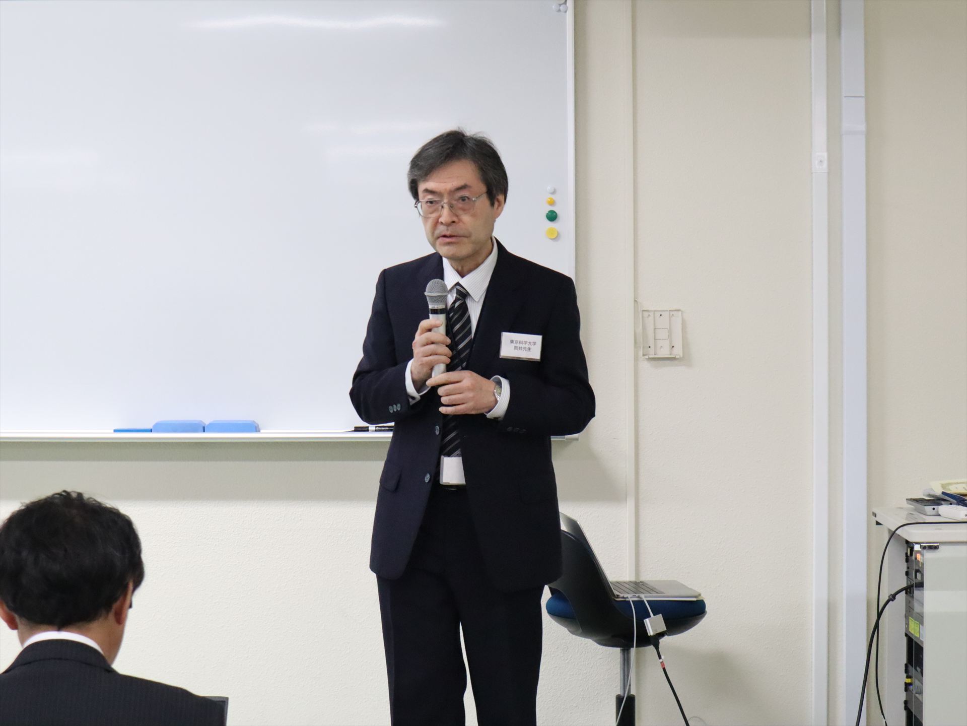 Integrated Green-niX Collegeの修了にあたり、企業を代表してタワーパートナーズセミコンダクター社 佐々木様、ならびにキャノンアネルバ株式会社 山中様より、お祝いのお言葉とともに企業における研究活動など経験を踏まえたお話をいただきました